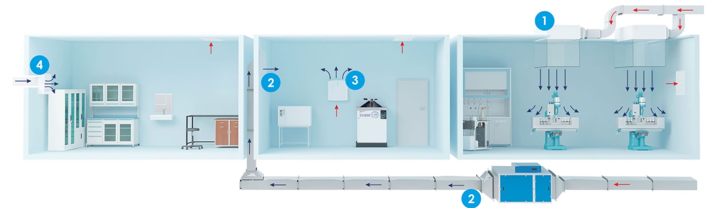 The inflow air is supplied to the assistant, defect detection, primary processing and filling, seaming and marking control, sterilization-autoclave and distillation rooms through a ventilation system with efficient air decontamination and purification in a range of at least 95% at the unit outlet (requirements for class B as per SP 2.1.3678-20). Since the air exchange rates are low and do not exceed 4 times, in case of small rooms up to 50m2 in area it can be expedient to install a compact inflow ventilation system (without laying of air ducts) with air purification instead of cantral ventilation.