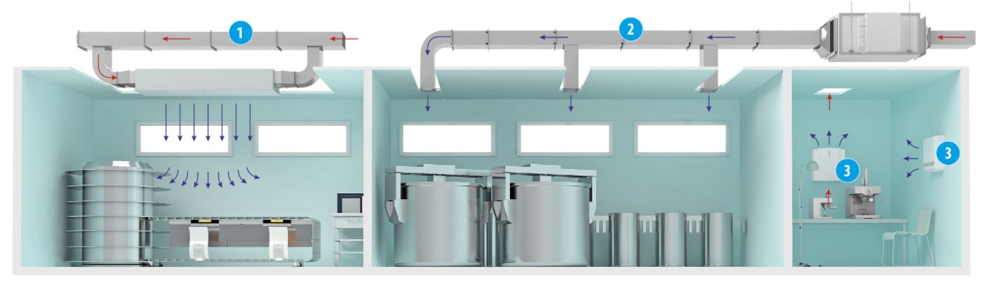 Mechanical ventilation systems also servicing the auxiliary areas of clean food production, where the container filling, transportation and other production stages are carried out, should be also provided with decontamination and purification of inflow air from harmful substances, dust in accordance with: Heating, Ventilation and Conditioning. H-11-H13 filtration class is recommended (ISO 6 class for surrounding areas, ISO 7, ISO 8 for auxiliary areas). For this purpose, integrated purification units are built into the inflow ventilation system and air passes through the filtration and decontamination system, and is supplied into a room through ceiling air distributors. Thus, filling, packing operations and storage of finished products and raw stock are protected from contamination from air.